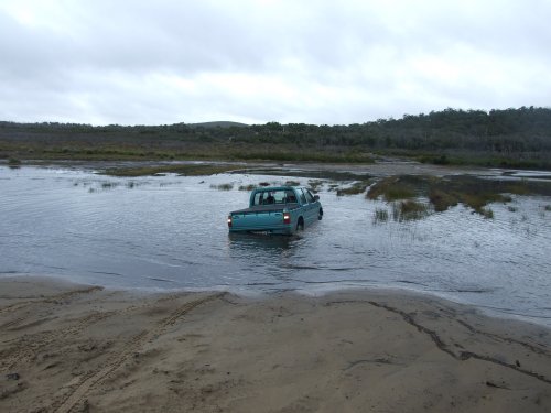Using my hand winch, we managed to turn Chris around (the sand was too soft to snatch easily) and drain most of the water out. But to avoid risking damage we decided to tow him home.